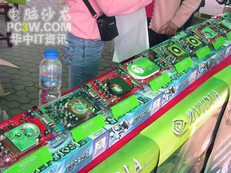 基于SM3.0、HDR以及SLI這三大顯示技術的GF6系顯卡產品擺滿了整個產品展示區的展臺。從入門級的6200TC直到最近被各大IT媒體所熱炒的6800GS,展示產品可以說是琳瑯滿目。