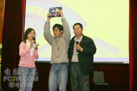 壓軸大獎是由商科集團武漢天行電腦提供的臺電超大彩屏MP4一個,得主是位帥GG,運氣真是不錯!上臺領獎時這位興奮的帥GG,激動之下突然主動曝光自己并不是華師的學生,而是武大學生路過華師看到這次活動......這下可不得了,臺下華師的GGMM怎么能看著到自己學校門口的大獎就這樣白白被拿走,還好這位帥GG也相當大方,回答了主持人提的問題,并滿足了觀眾們的要求表演了小節目。