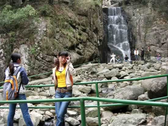 柘林瀑前美女倚架,后面的帥哥看過來。