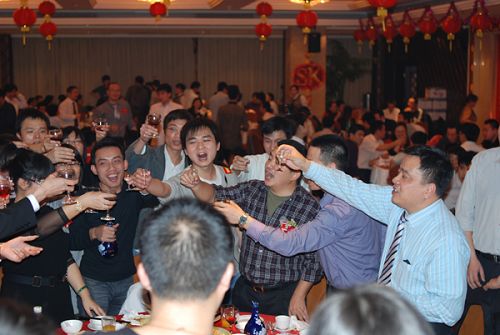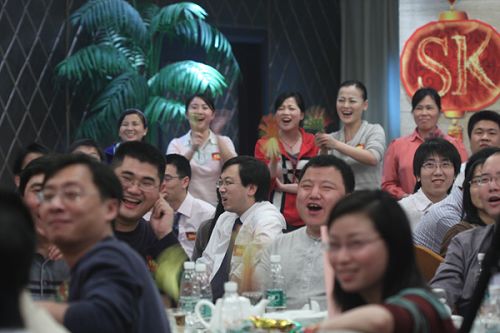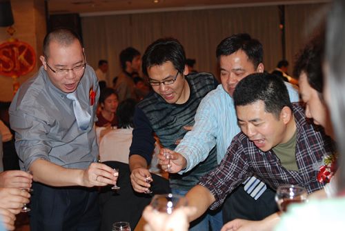 商科集團孫總、劉總依次向各部門員工敬酒,表達公司領導對員工的關懷,宴會在歡樂的氣氛中進行
