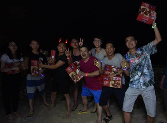 到了海邊,除了體驗(yàn)美麗的海島風(fēng)情,當(dāng)然還要享受海鮮大餐,魚蝦蟹貝,美味的晚餐盛宴,讓大家大飽口福。大快朵頤之后,開始了篝火晚會(huì)。在海灘上,伴著陣陣的濤聲,歡快的音樂聲,大家挽著手,環(huán)成圈,跑著,跳著,忘卻一切壓力與煩惱,盡情歡暢。期間,還對(duì)下午比賽勝出的隊(duì)伍進(jìn)行了頒獎(jiǎng),沒有獲獎(jiǎng)的隊(duì)伍也不要沮喪喲,你們都是最棒的!