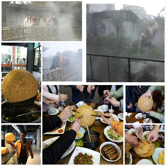 前往“福地傳說”酒店,品嘗此次旅行在郴州的最后一頓午餐。最有特色的是芝麻球,看著師傅制作,非常有意思。一上桌,迫不及待地念了句“嘛呢叭咪吽”,芝麻球順勢而破。嘗一塊,又香又脆。