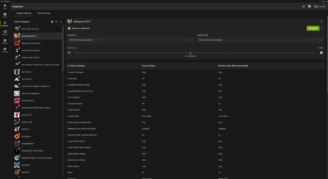 對于游戲玩家來說,圖形設(shè)置十分重要。現(xiàn)在通過NVIDIA App,用戶只需點擊“優(yōu)化”按鈕,即可自動配置游戲的所有設(shè)置,并啟用包括 DLSS 和 Reflex 在內(nèi)的 NVIDIA 技術(shù),還可以通過 NVIDIA 控制面板中的“管理 3D 設(shè)置”進(jìn)一步配置游戲和應(yīng)用,以全局或針對某個游戲啟用和覆蓋驅(qū)動功能。NVIDIA app 將所有這些選項集成在一個易于訪問、響應(yīng)迅速的“圖形”選項卡中。