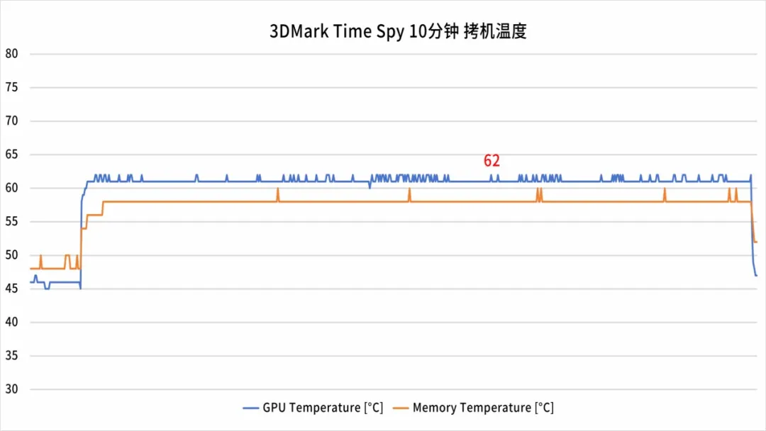 除了頻率優(yōu)勢,散熱效能在顯卡的穩(wěn)定性和耐用性方面同樣至關(guān)重要。銘瑄 Intel Arc B580顯卡采用正逆轉(zhuǎn)導(dǎo)流散熱設(shè)計(jì),相鄰風(fēng)扇的旋轉(zhuǎn)方向不同,有效減少繞流,增加進(jìn)風(fēng)量,從而顯著提升了散熱效能。以MAXSUN Intel Arc B580 iCraft 12G為例,在進(jìn)行10分鐘的Time Spy烤機(jī)測試時,顯卡溫度僅為62度,在高負(fù)載運(yùn)行時仍能保持低溫,穩(wěn)定輸出性能。這種優(yōu)秀的散熱設(shè)計(jì)不僅延長了顯卡的使用壽命,也為用戶提供了更佳的使用體驗(yàn)。