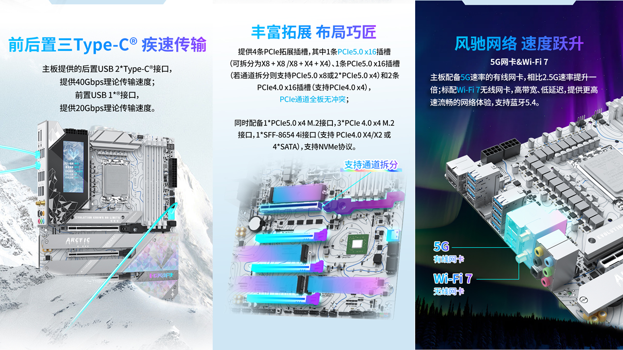 而要讓這顆 “強芯” 充分釋放潛能,離不開一塊實力與顏值兼備的主板 —— 銘瑄 iCraft Z890 Arctic 正是這樣的存在。這款主板作為iCraft系列的高端型號,以 “北冰洋” 為設計靈感,采用冰原美學設計。特殊的鈦冰晶圖案搭配炫彩元素,整體色調統一且富有質感,擺在機箱中宛如一件冰雕藝術品,完美適配當下流行的白色主機風格,與《戰地 6》的冰雪戰場形成奇妙呼應。