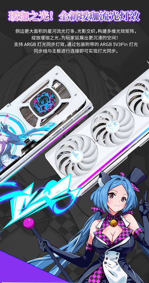燈效方面,這款顯卡具備更大面積的側邊星河流光燈條,光影交織,構建多維光效矩陣,支持ARGB燈光同步,璦珈RGB合金背板創新加入夢幻撞色燈效,層疊幻彩光影,為玩家延展出更沉浸的空間。