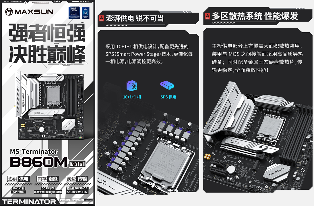 好馬配好鞍,想要充分釋放處理器的性能,一塊適配且性能強(qiáng)悍的主板必不可少。銘瑄Terminator B860M WIFI主板采用Micro-ATX板型,外觀上延續(xù)了終結(jié)者系列的經(jīng)典撞色設(shè)計(jì),黑色PCB搭配銀白色散熱裝甲,低調(diào)中透著滿滿的科技感,質(zhì)感十足。供電方面這款主板也是誠意滿滿,采用了10+1+1 相 SPS 供電設(shè)計(jì),配備更先進(jìn)的 SPS(Smart Power Stage)技術(shù),更佳化每一相電源,使得電源調(diào)控更加高效穩(wěn)定,穩(wěn)定支持英特爾酷睿 Ultra 5 225F 處理器。即使處理器處于滿負(fù)載運(yùn)行狀態(tài),也能持續(xù)輸出穩(wěn)定電力,避免卡頓掉幀等問題。為了讓供電系統(tǒng)時(shí)刻保持冷靜,主板供電部分上方覆蓋大面積散熱裝甲,裝甲與 MOS之間接觸面采用高品質(zhì)導(dǎo)熱硅條,能快速傳導(dǎo)并散發(fā)運(yùn)行時(shí)產(chǎn)生的熱量;同時(shí)還配備金屬固態(tài)硬盤散熱片, 讓硬件性能全面釋放,傳輸更穩(wěn)定。