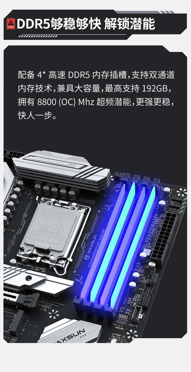 內(nèi)存方面,這款主板同樣能打。它配備4條高速DDR5內(nèi)存插槽,支持雙通道內(nèi)存技術(shù),兼具大容量,最高支持192GB,擁有8800 MHz(OC)超頻潛能,更強(qiáng)更穩(wěn)。再加上英特爾酷睿 Ultra 5 225F處理器對CUDIMM內(nèi)存的支持,更為沖擊高內(nèi)存頻率提供了可能。對于游戲玩家和追求高性能的用戶來說,高頻內(nèi)存能夠有效提升系統(tǒng)的數(shù)據(jù)讀寫速度,減少游戲加載時(shí)間,提升多任務(wù)處理能力,快人一步搶占先機(jī)。