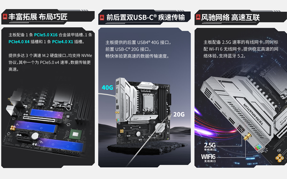 拓展性方面,銘瑄Terminator B860M WIFI主板堪稱 “全能選手”, 接口豐富且實(shí)用。 它配備 1 條 PCIe5.0 X16 合金裝甲插槽,有效防止因顯卡過重導(dǎo)致的插槽變形,給顯卡穩(wěn)穩(wěn)的支撐;同時(shí)還搭載 1 條 PCIe4.0 X4 插槽和 1 條 PCIe4.0 X1 插槽,可靈活連接萬兆網(wǎng)卡、擴(kuò)展卡等外設(shè)。存儲(chǔ)接口同樣充裕,提供 3 個(gè)滿速 M.2 硬盤接口,均支持 NVMe 協(xié)議,其中 1 個(gè)更是支持 PCIe5.0 x4 速率,海量存儲(chǔ)輕松擴(kuò)容,數(shù)據(jù)傳輸高速高效。后置 USB4 40G 接口與前置 USB-C 20G 接口的搭配,讓數(shù)據(jù)傳輸速度再上一個(gè)臺(tái)階,暢快體驗(yàn)無需等待。網(wǎng)絡(luò)體驗(yàn)也不拉胯!主板配備 2.5G 速率有線網(wǎng)卡和 Wi-Fi 6 無線網(wǎng)卡,同時(shí)支持藍(lán)牙 5.2,有線、無線雙模式自由選擇,無需額外升級(jí)。無論是有線連接的穩(wěn)定高速,還是無線連接的便捷靈活,都能有效避免網(wǎng)絡(luò)卡頓和延遲,不管是沉浸式游戲娛樂,還是高效遠(yuǎn)程辦公,都能輕松應(yīng)對。