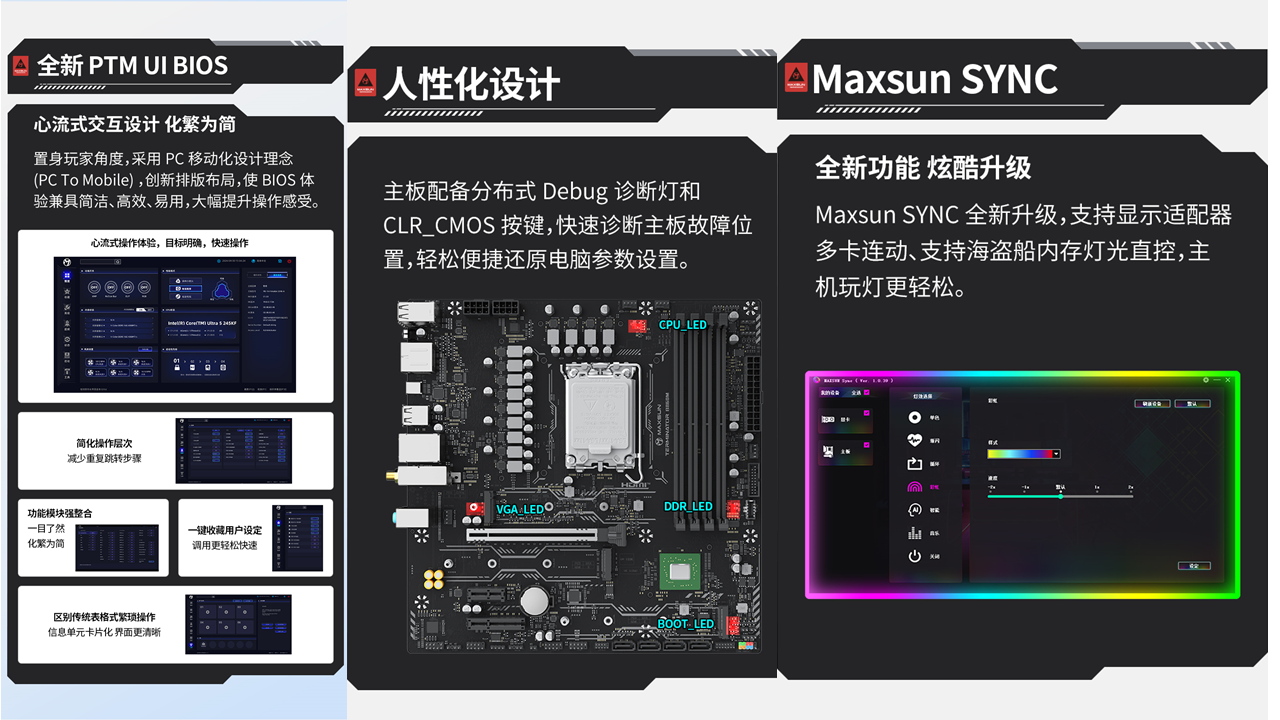 除了硬核配置,這款主板的貼心設(shè)計(jì),更是讓裝機(jī)和使用體驗(yàn)直接拉滿。全新升級(jí)的PTM UI BIOS,借鑒手機(jī) APP 的交互邏輯,采用模塊化設(shè)計(jì),交互層級(jí)不超過 2 層,手機(jī)端風(fēng)格的卡片式界面,讓復(fù)雜的 BIOS 設(shè)置變得簡單易懂,即使是新手玩家也能輕松上手。分布式 Debug 診斷燈和CLR_CMOS 快捷按鈕能快速定位故障,小白也能輕松排查問題,讓裝機(jī)全程省心省力,告別復(fù)雜操作。它還支持RGB光效同步,可與顯卡、內(nèi)存等外設(shè)實(shí)現(xiàn)燈光聯(lián)動(dòng),隨心切換炫酷燈光效果,無論是打造黑色電競主機(jī),還是組裝純白海景房,都能完美適配,輕松打造氛圍感拉滿的裝機(jī)效果。